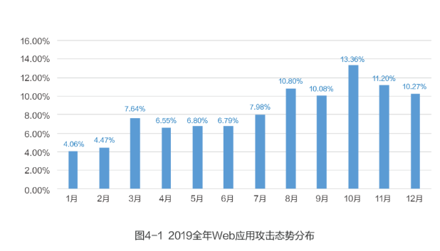 2019年网宿平台共监测并拦截了12.86亿次Web应用攻击,同比增长34.94%,全年来看,Wed攻击量呈平稳增长,在10月份达到顶峰。